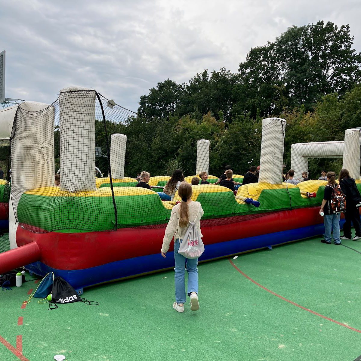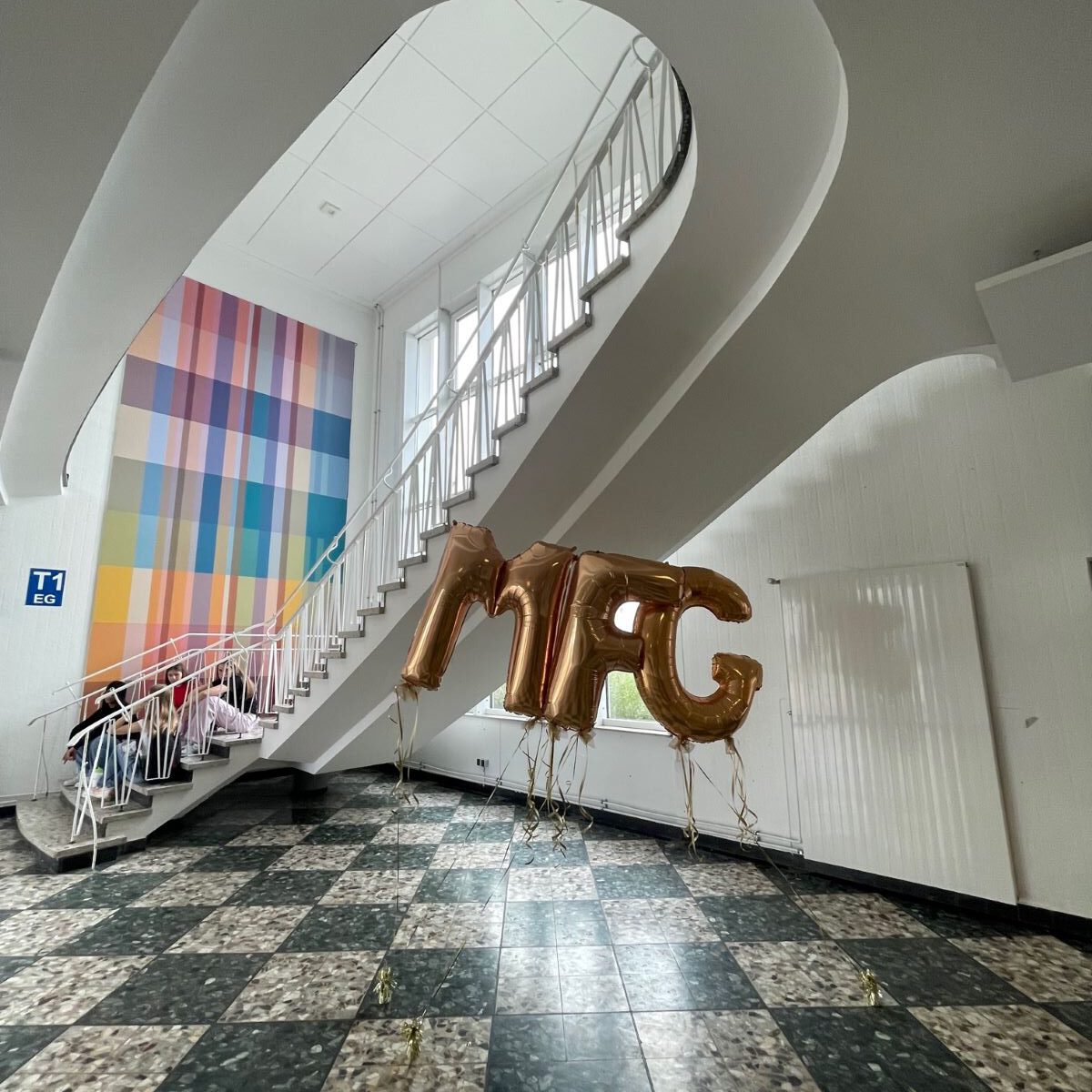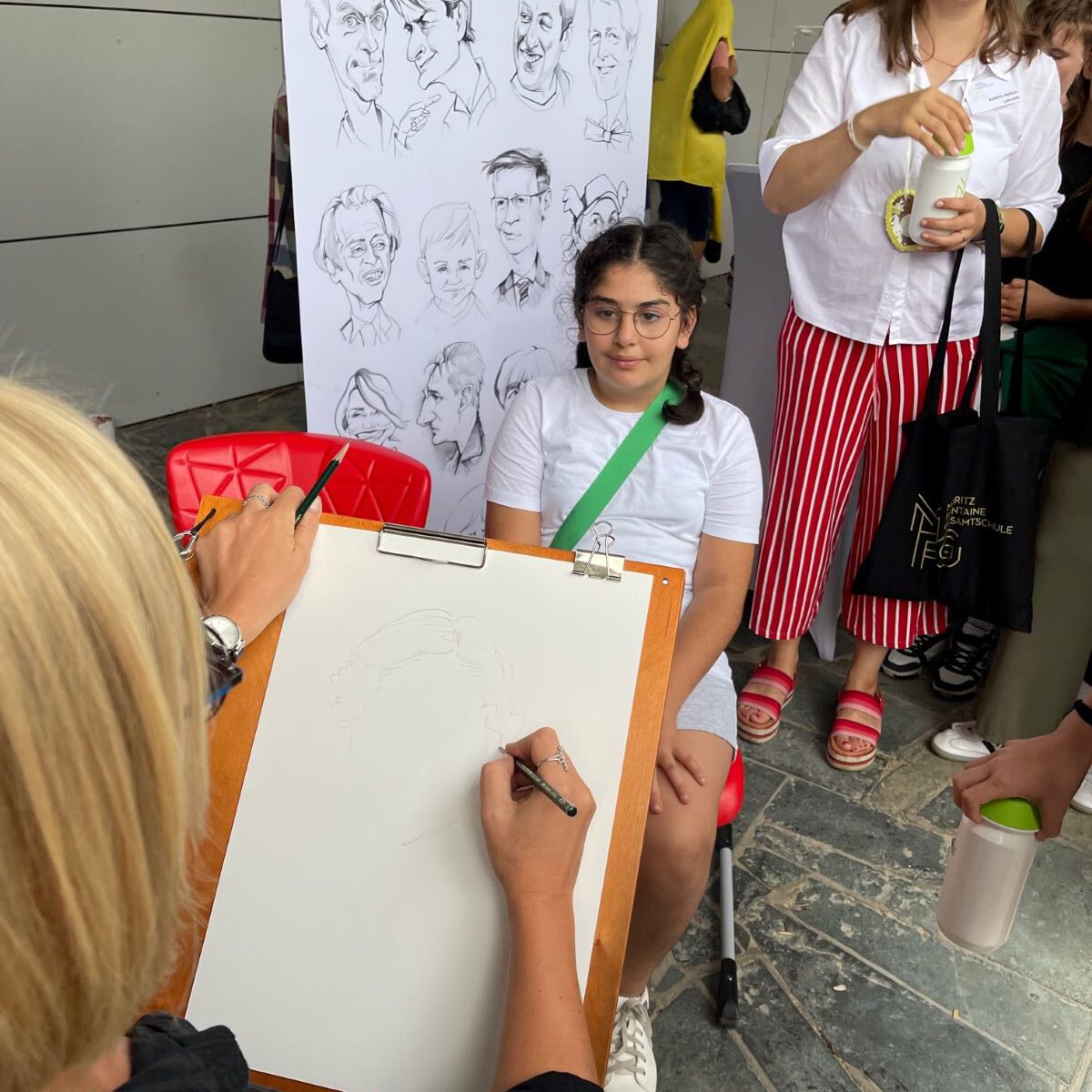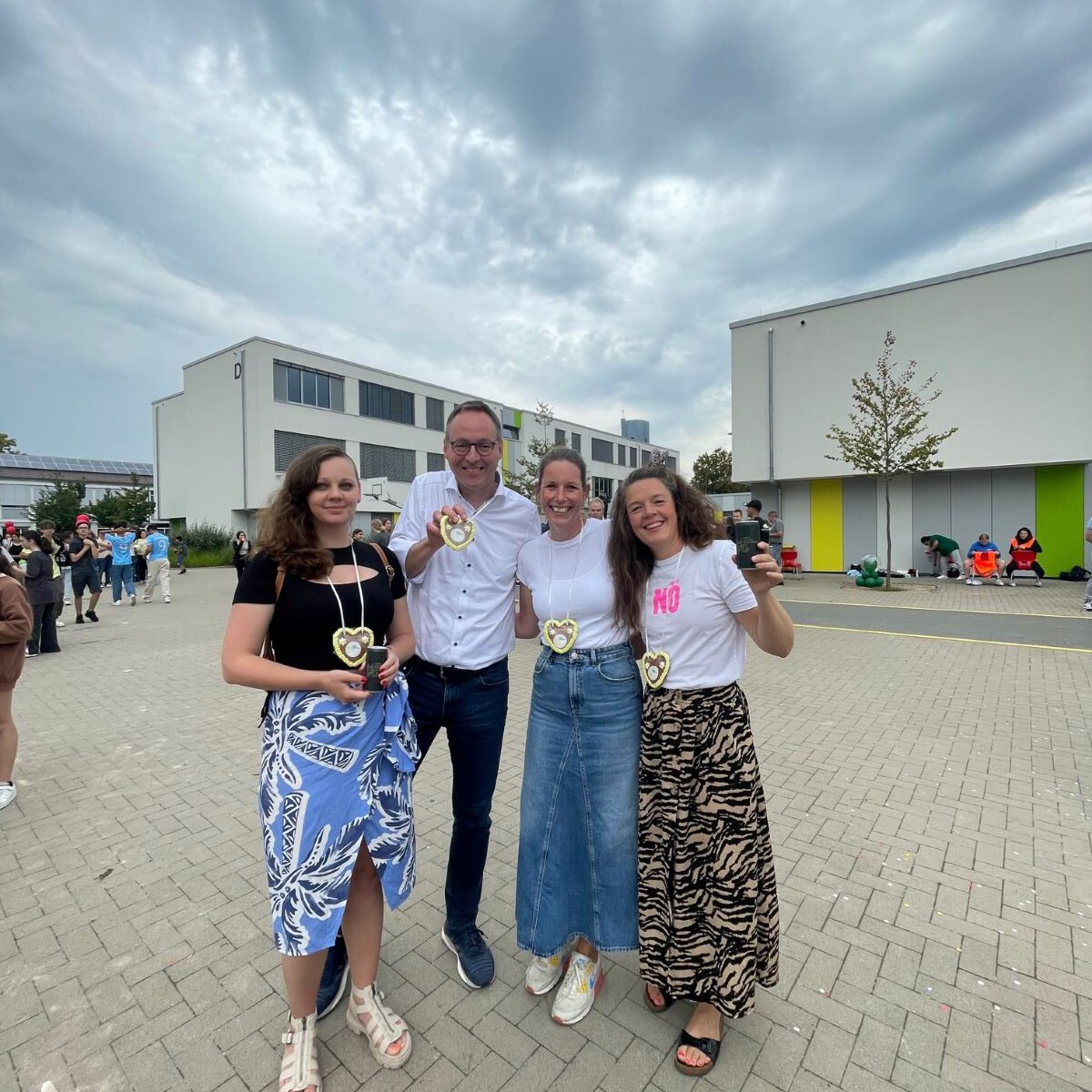 So begann der Tag fröhlich mit der schuleigenen Cheerleading-Gruppe, die ein Menschenkickerspiel zwischen Lehrerkollegium und Schülerschaft einleitete. Kulinarische Köstlichkeiten der Oberstufe und der SV verwöhnten die Gaumen der Besucher. Nach dem Jubiläumsmotto „10 Jahre MFG -Jahrmarkt der Möglichkeiten“ wurde der Geburtstag mit verschiedenen Jahrmarktbuden, attraktiven Spiel-, Sport- und Bewegungsangeboten sowie einer sehr gut angenommenen ukrainische Karikaturzeichnerin gebührend gefeiert. Der Lehrerchor stimmte alle Feiernden mit dem Lied „Ein Hoch auf uns“ ein. Es folgte die Rede des Bürgermeisters Theo Mettenborg, der die Schule ganz herzlich beglückwünschte. Ebenso kamen Vertreterinnen und Vertreter der Hauptsponsoren der Bürgerstiftung, des Fördervereins, der Kreissparkasse Rheda-Wiedenbrück, der Firma Venjakob und der Firma Tönnies, die diese Festlichkeiten erst ermöglichten.