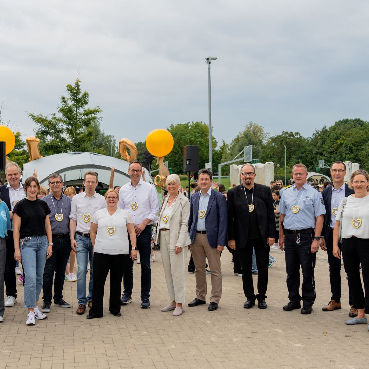 Rheda-Wiedenbrück (pbm). Seit stolzen 10 Jahren leben und lernen Schülerinnen und Schüler aus Rheda-Wiedenbrück an den zwei Standorten der Moritz-Fontaine-Gesamtschule. Nun gab es ein Fest, das die gesamte Schulfamilie zusammenbrachte, denn rund 1400 Schülerinnen und Schüler, Lehrkräfte, Eltern, Gäste und Sponsoren versammelten gemeinsam auf dem weitläufigen Schulhof des Standortes in Rheda.