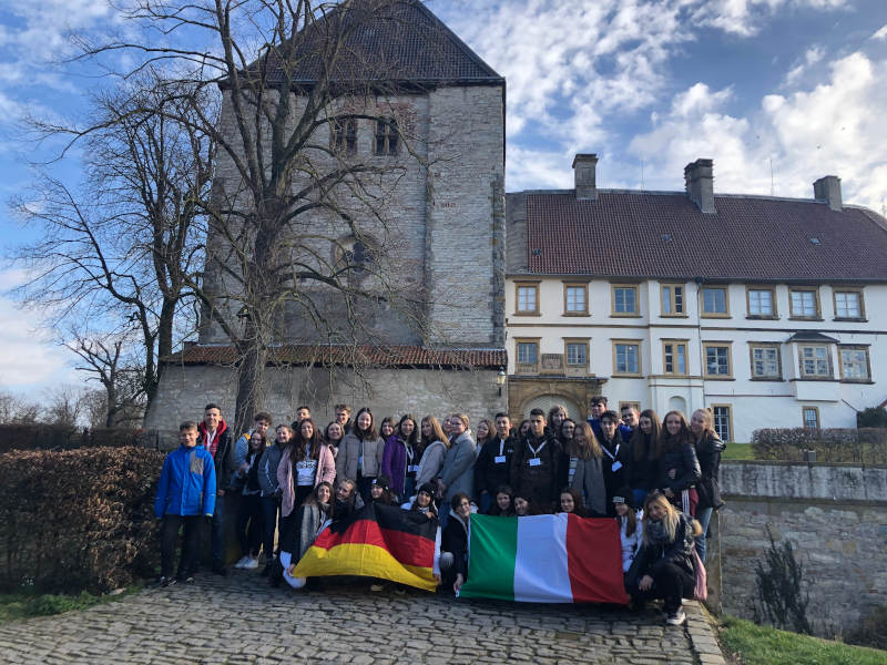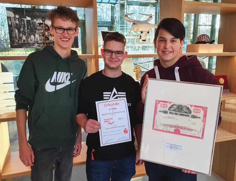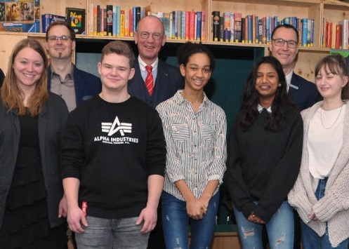 Johannes Hüser (h.R. 3. v.l.) und Rainer Hagemeister (h.R. 2. v.r.) mit (v.l.) Maria Hofemeister, Dominik Heikel, Michael May und den Schülerinnen und Schülern der Bücherei-AG am Standort in Rheda. Schulbibliothek nimmt Fahrt auf Die Städtische Gesamtschule freute sich, dass sie Johannes Hüser, Vorstandsvorsitzender der Kreissparkasse Wiedenbrück, und Rainer Hagemeister, Leiter der Geschäftsstelle Rheda, zu…