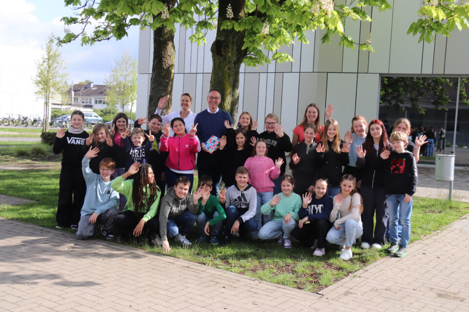 Rheda-Wiedenbrück (pbm). Wie sieht ein Tag im Leben eines Bürgermeisters aus? Welche Termine stehen im Kalender? Diese und auch ganz klassische Fragen nach der Lieblingsfarbe oder dem Lieblingsverein stellten die 5. Klässler der Moritz-Fontaine-Gesamtschule (MFG) Bürgermeister Theo Mettenborg. Am Standort in Rheda ging es in der bilingualen Klasse direkt mit dem Spiel „Ich packe meinen…