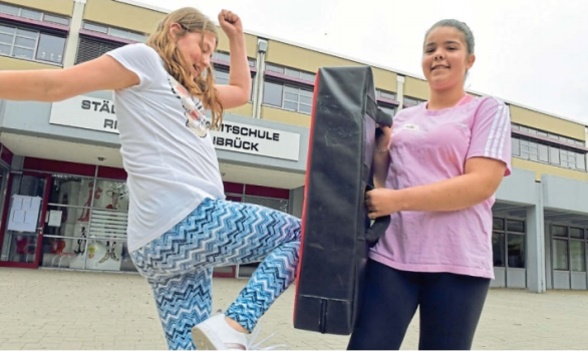 erschienen in „Die Glocke“, 19.07.2019 „Stopp“: Sich laut und deutlich abgrenzen haben die Teilnehmerinnen im Selbstbehauptungskursus an der Gesamtschule am Burgweg in Wiedenbrück gelernt. Das Bild zeigt (v. l.) Schulsozialarbeiterin und Deeskalationstrainerin Anja Carré sowie die Teilnehmerinnen Tibel (11), Kimberley (10), Michelle (13), Lana (12) und Emma (11). Rheda-Wiedenbrück (gl). Spaß wollen sie haben, die fünf…
