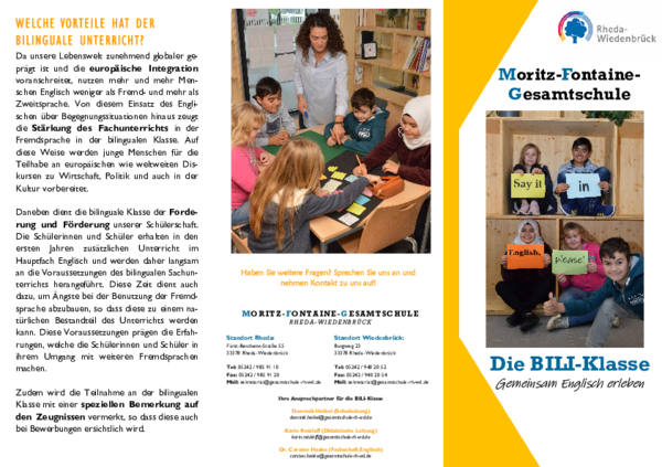 Die BiLi-Klasse an der Moritz-Fontaine-Gesamtschule ist ein spezielles Angebot für Schülerinnen und Schüler, die vom erweiterten Einsatz der englischen Sprache im Unterricht profitieren möchten. Seit 2020 wird an unserem Schulstandort Rheda bilingualer Unterricht angeboten, der auf einer intensiven Förderung im Fach Englisch basiert und gezielt auf Fachunterricht in englischer Sprache vorbereitet.